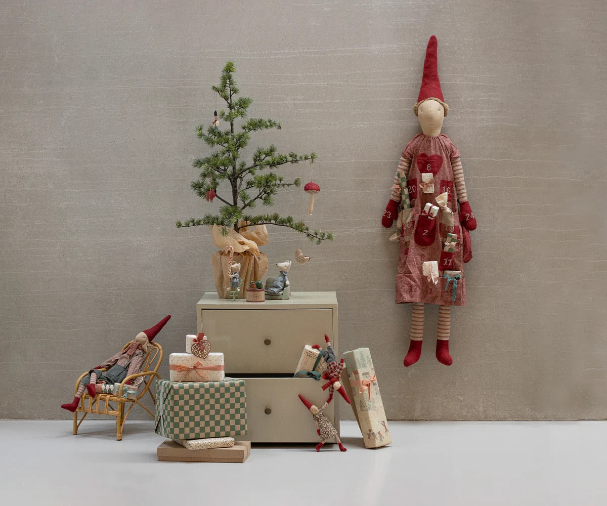 Mailegs pixy collection contains many different styles - all dressed up in Christmas clothes made of exclusive materials. They are adorable and can be mixed and matched across sizes and collections. Size 1 has magnet in hands and left foot.